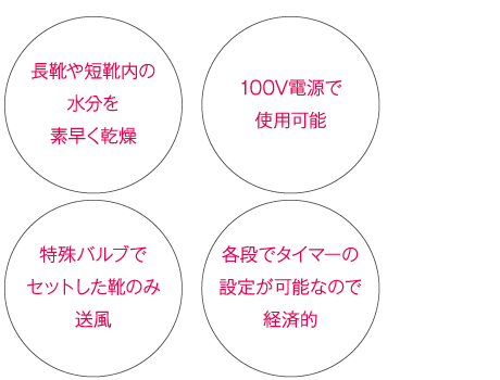 長靴や作業靴を清潔に保つための乾燥機です。靴を掛けたノズル先端から送風し、靴内の水分を素早く乾燥します。素早く乾燥するのでとっても衛生的です。